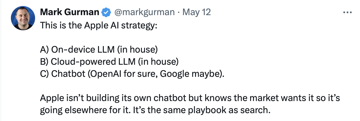 Post de Mark Gurman en X sobre los modelos de lenguaje que va a anunciar Apple en la próxima WWDC.