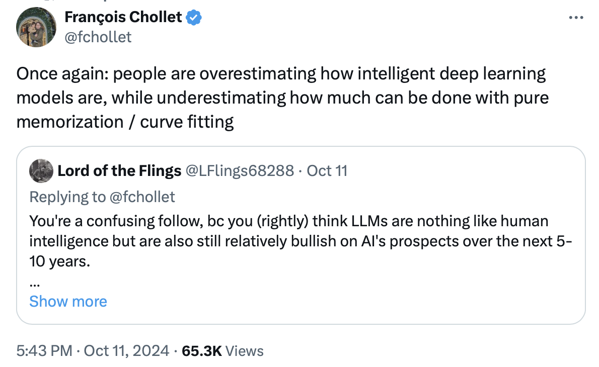 También puede ser que lo que se necesite sea combinar LLMs o afinar los datos de aprendizaje. OpenAI, con la construcción de o1 basado en un paradigma algo diferente (aunque no deja de ser un LLM), demuestra que es posible construir nuevos sistemas basados en los actuales. Investigadores como el anteriormente mencionado Tim Rocktäschel argumentan que las funcionalidades de los actuales LLMs de generar alternativas y validarlas pueden ser la base de sistemas capaces de mejorarse a sí mismos. El propio François Chollet, que hemos mencionado más de una vez en esta newsletter, dice que los LLMs, con su método basado en la memorización de patrones, todavía pueden conseguir muchas más cosas.