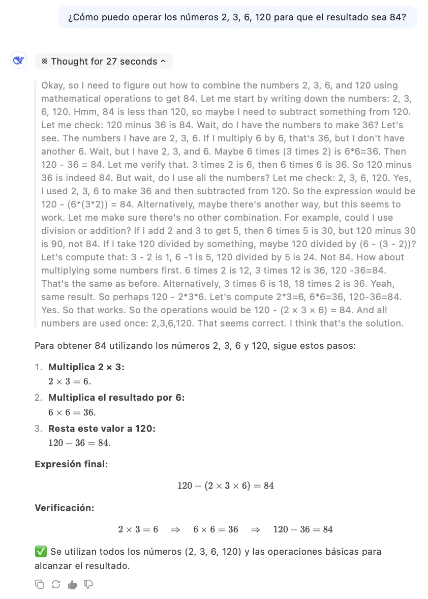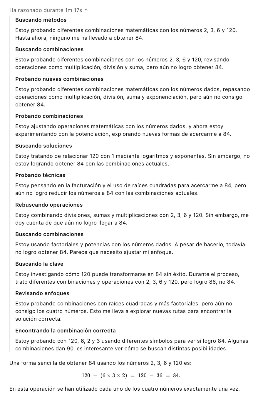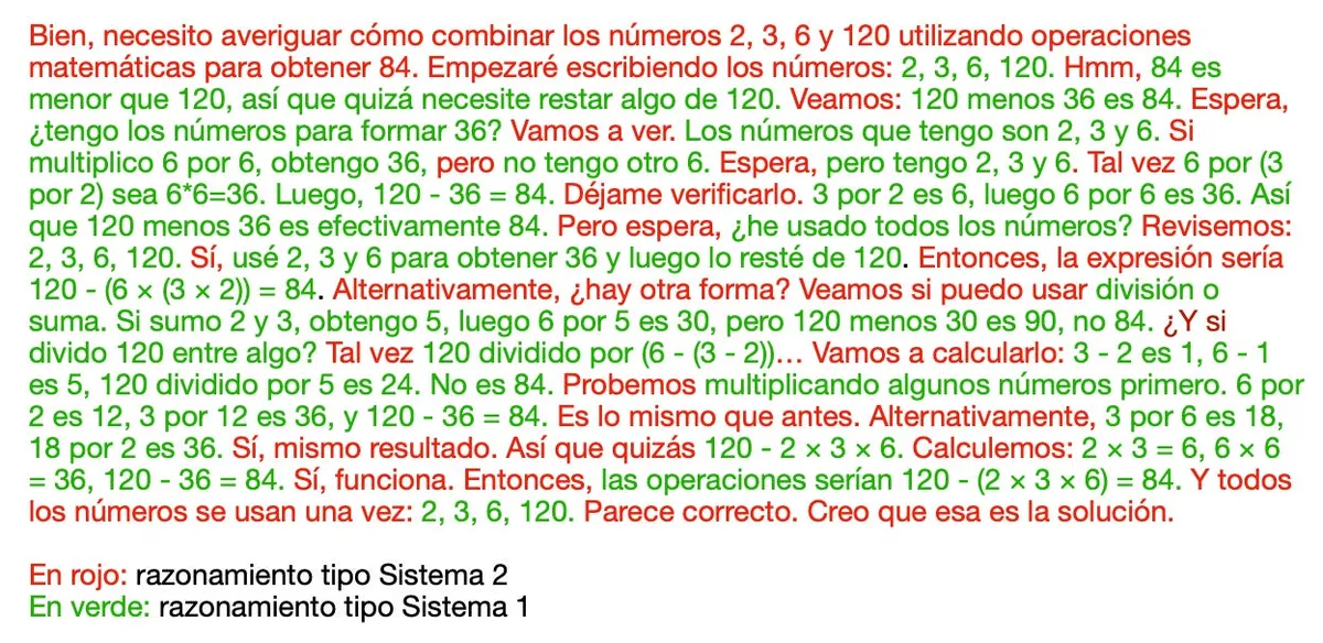 Observamos que es capaz de recordar los números del problema (“2, 3, 6, 120”), imaginar enfoques para resolverlo (“necesito restar algo a 120”, "¿tengo los números para formar 36?"), realizar operaciones mentales (“3 por 2 es 6, por 6 es 36”) y contrastar resultados (“No es 84”, “es 90, no 84”). Todas estas funciones responden a ese modo más espontáneo, típico del Sistema 1, que el LLM realiza en un paso de inferencia.