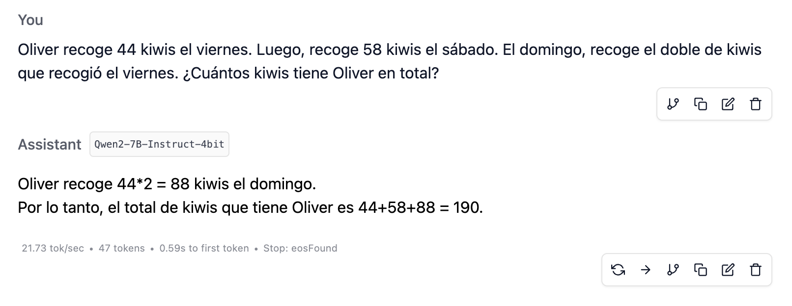 He descargado LM Studio en mi MacBook Air (M3 con 16 GB de RAM) y he probado los modelos pequeños Qwen2-7B-Instruct-4bit y Meta-Llama-3.1-8B-Instruct-4bit . Ambos lo resuelven sin problema, como se muestra en la imagen.