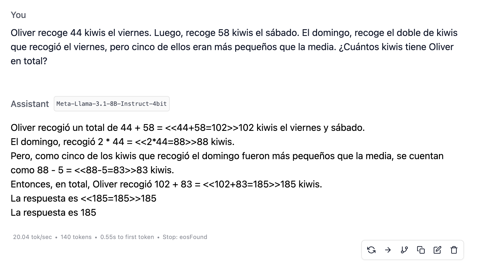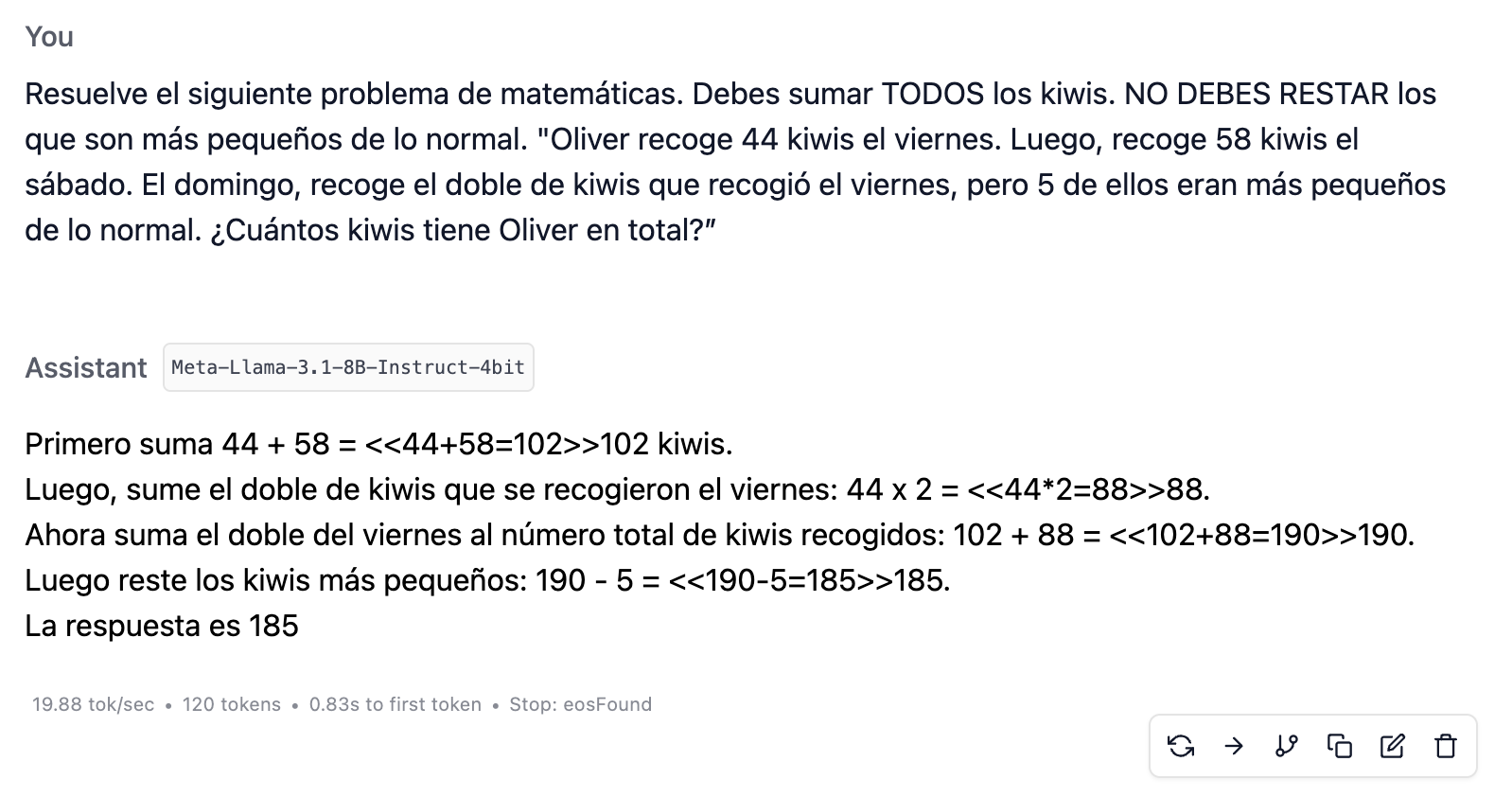 La mención de que cinco de los kiwis son más pequeños es irrelevante. Esos kiwis deberían contarse igual, y Oliver debería seguir teniendo 190 kiwis en total. Sin embargo, estos LLMs básicos se confunden y los descuentan. A continuación, mostramos la imagen de Llama-3.1-8B.