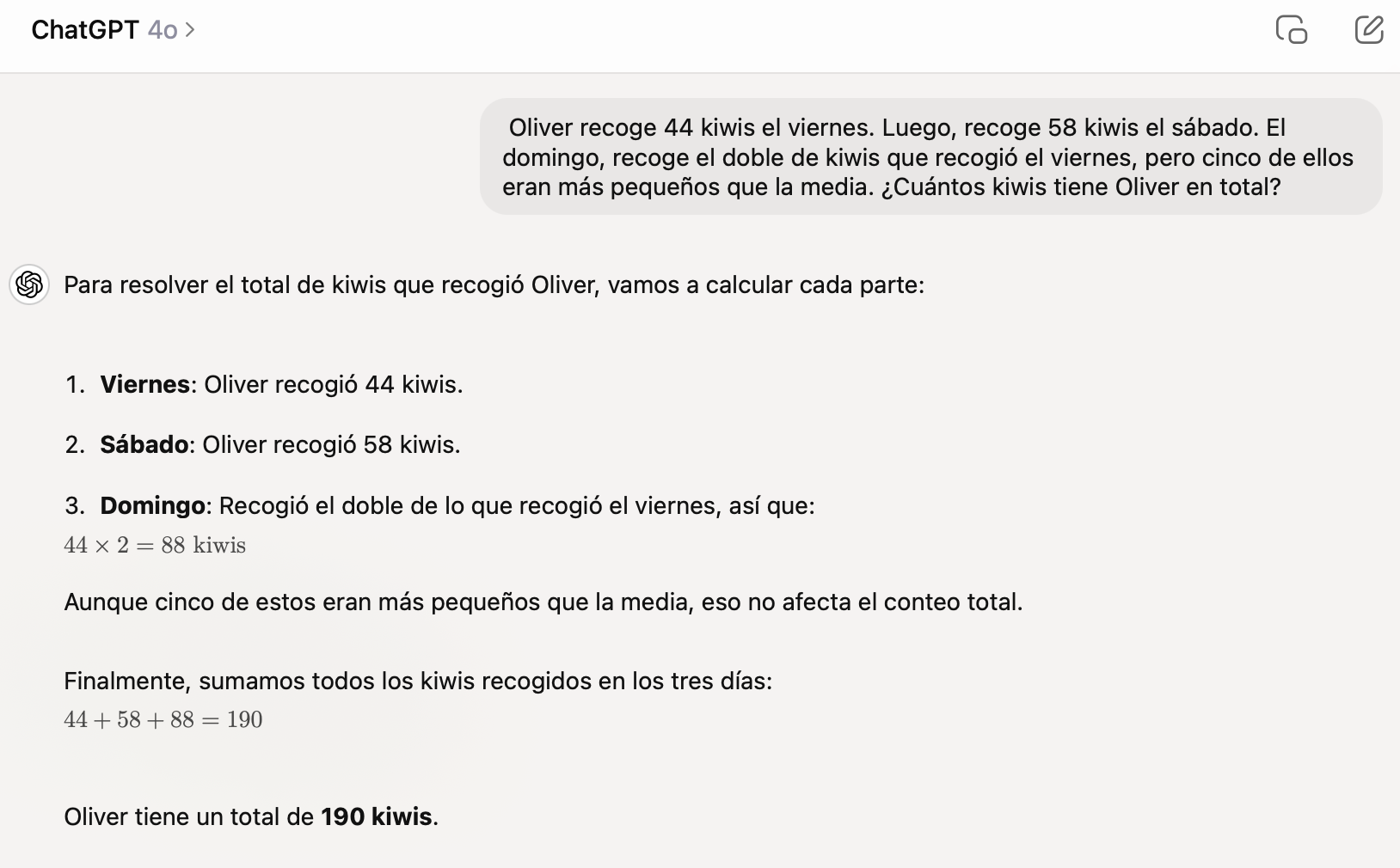Al probar el problema original de los kiwis, vemos que este salto de dos órdenes de magnitud se nota bastante: ChatGPT 4o lo resuelve siempre perfectamente.