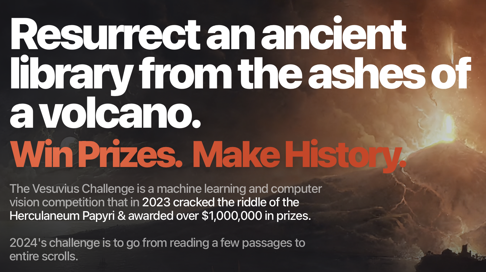 Portada de la web de la competición Vesuvius Challenge en la actualidad.