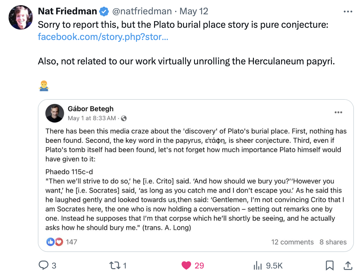 Post en X de Nat Friedman sobre la noticia de la tumba de Platón y los papiros de Herculano.