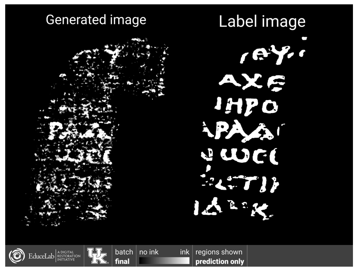Después de numerosos intentos, Parsons logra desarrollar un modelo que, utilizando estos fragmentos de papiros, produce resultados iniciales prometedores. En la siguiente figura se muestra el resultado final de la salida de la red neuronal (a la izquierda), en la que los puntos blancos representan tinta. Vemos que hay bastante ruido, pero que se identifican correctamente algunas letras.